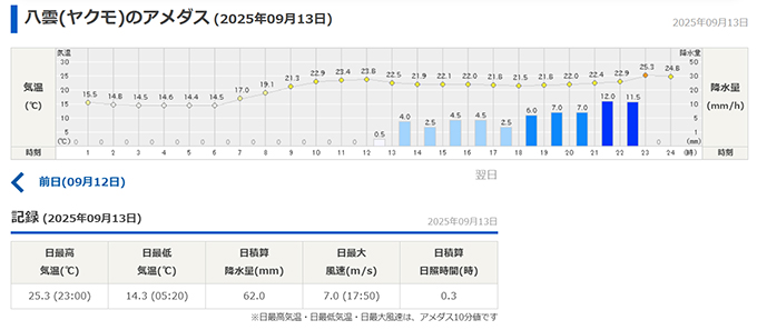 2025年9月13日、北海道南部の八雲町で昼から夜にかけて、62㎜の雨が降った。
